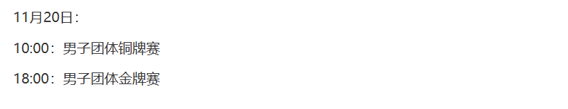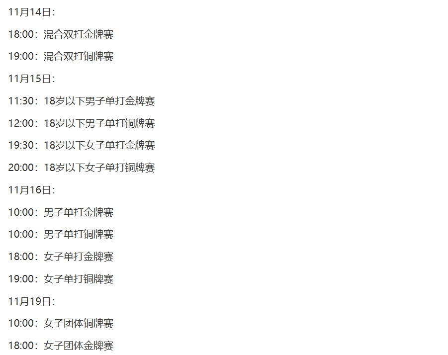 本届全运会的乒乓球项目将会在澳门进行。比赛时间从11月7日开始,到11月20日结束。时间紧,任务重,对运动员来说,都是巨大的考验。(赛程如下图)